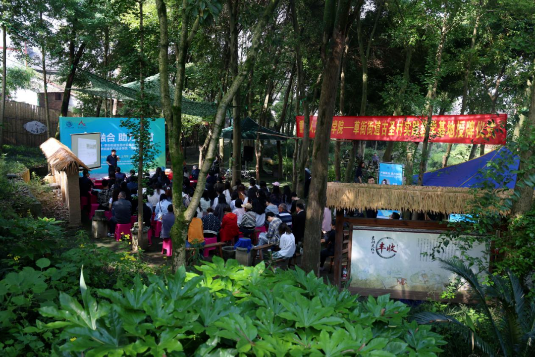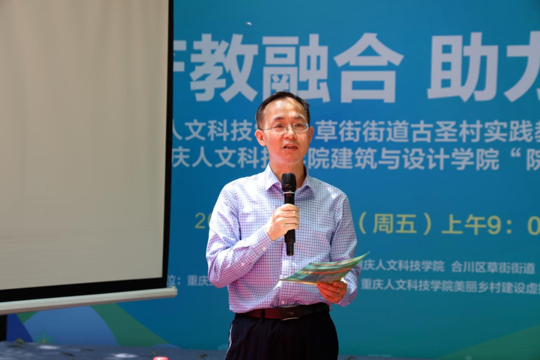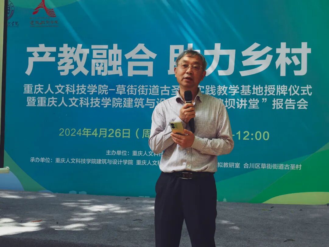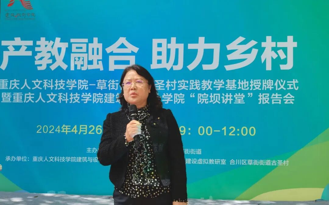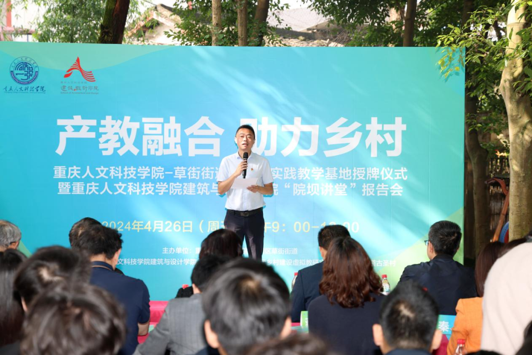 为进一步强化学院产教融合、智力服务地方经济建设的办学特色,推进乡村振兴入课堂活动见实效,4月26日上午,重庆人文科技学院建筑与设计学院与草街街道古圣村在陶行知先生纪念馆联合举办重庆人文科技学院草街街道古圣村实践教学基地授牌仪式暨建筑与设计学院“院坝讲堂”报告会。本次活动得到了合川区教委和草街街道党政领导的高度重视,得到了古圣村村党委及村委会和广大村民的大力支持,合川区教委副主任秦燕江、高校服务中心主任刘莉、古圣村驻村第一书记蒋文兰以及草街街道相关领导,学校副校长孙敏、校长助理双海军、科研处、教务处、党委宣传部、建筑与设计学院相关负责人及学生、村民代表近一百人参加了授牌仪式。