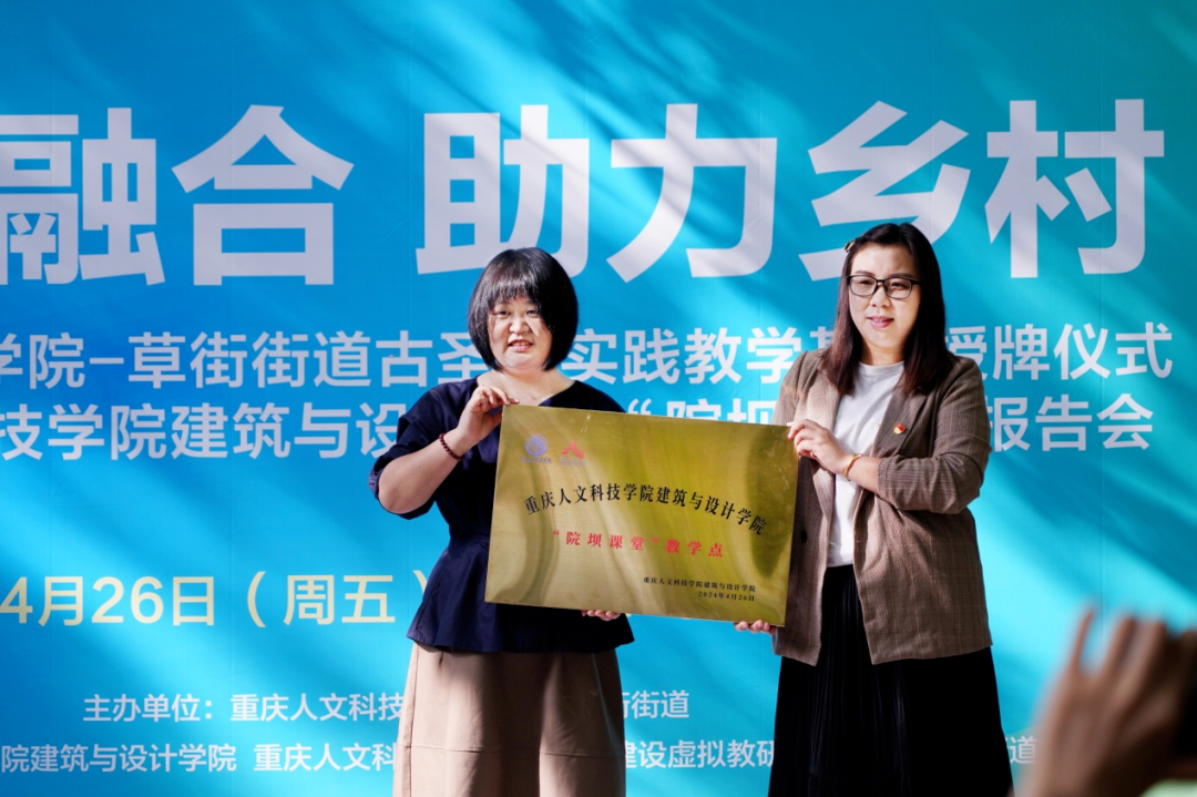 建筑与设计学院党总支书记唐湘晖与草街街道古圣村党委副书记刘海燕一起为建筑与设计学院“院坝课堂”教学点进行挂牌。