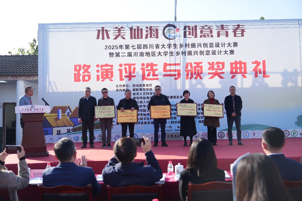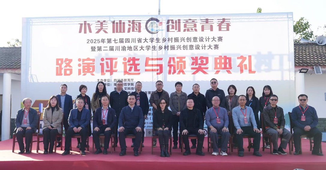 11月8日,由四川省教育厅主办,我校乡村振兴学院与绵阳师范学院共同承办的2025年(第七届)四川省大学生乡村振兴创意设计大赛暨第二届川渝地区大学生乡村振兴创意设计大赛一等奖入围作品路演评选与颁奖表彰会,在绵阳市仙海区沉抗镇铜瓦村村委会隆重举行。四川省教育厅高等教育处主任杜敏通,绵阳师范学院副校长王杨,我校校长助理、乡村振兴学院院长双海军,乡村振兴学院常务副院长、建筑与设计学院院长张雄等领导出席,川渝地区30所高校的师生代表、评审专家、地方政府领导及媒体代表共聚一堂齐聚一堂,共同见证这场融合创意、实践与乡村振兴使命的盛会。